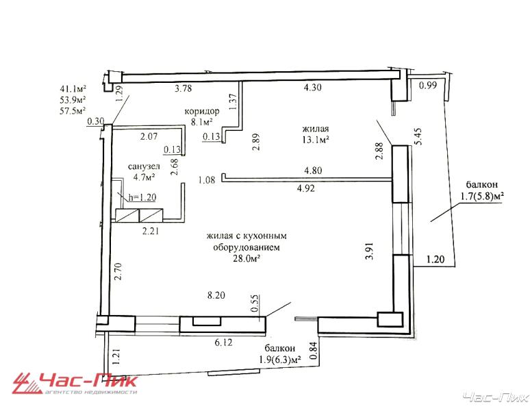 Площадь общ./жил./кух.: 57,5/41,1/10