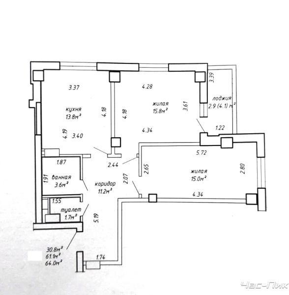 Площадь общ./жил./кух.: 64/30,8/13,8