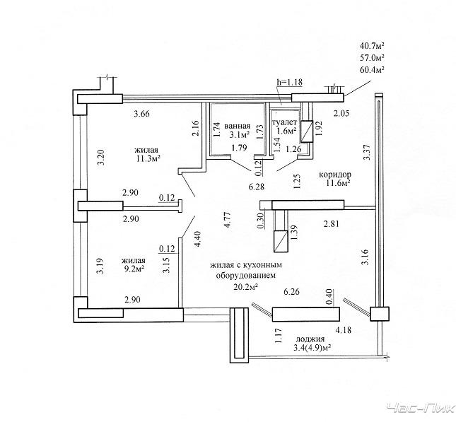 Площадь общ./жил./кух.: 60,4/40,7/12