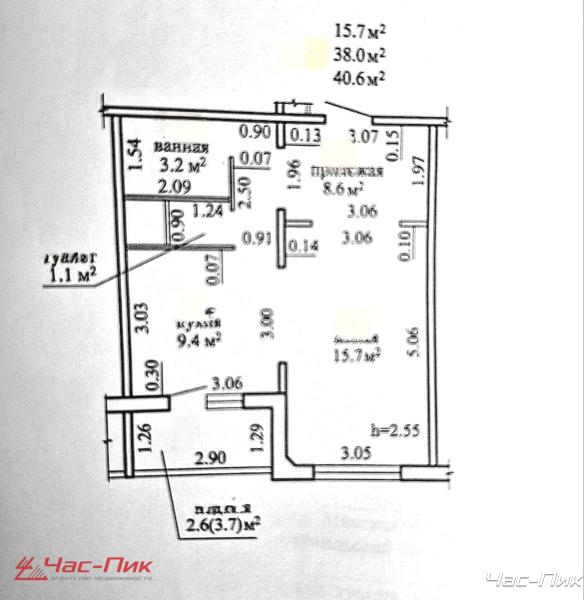 Площадь общ./жил./кух.: 40,6/15,7/9,4
