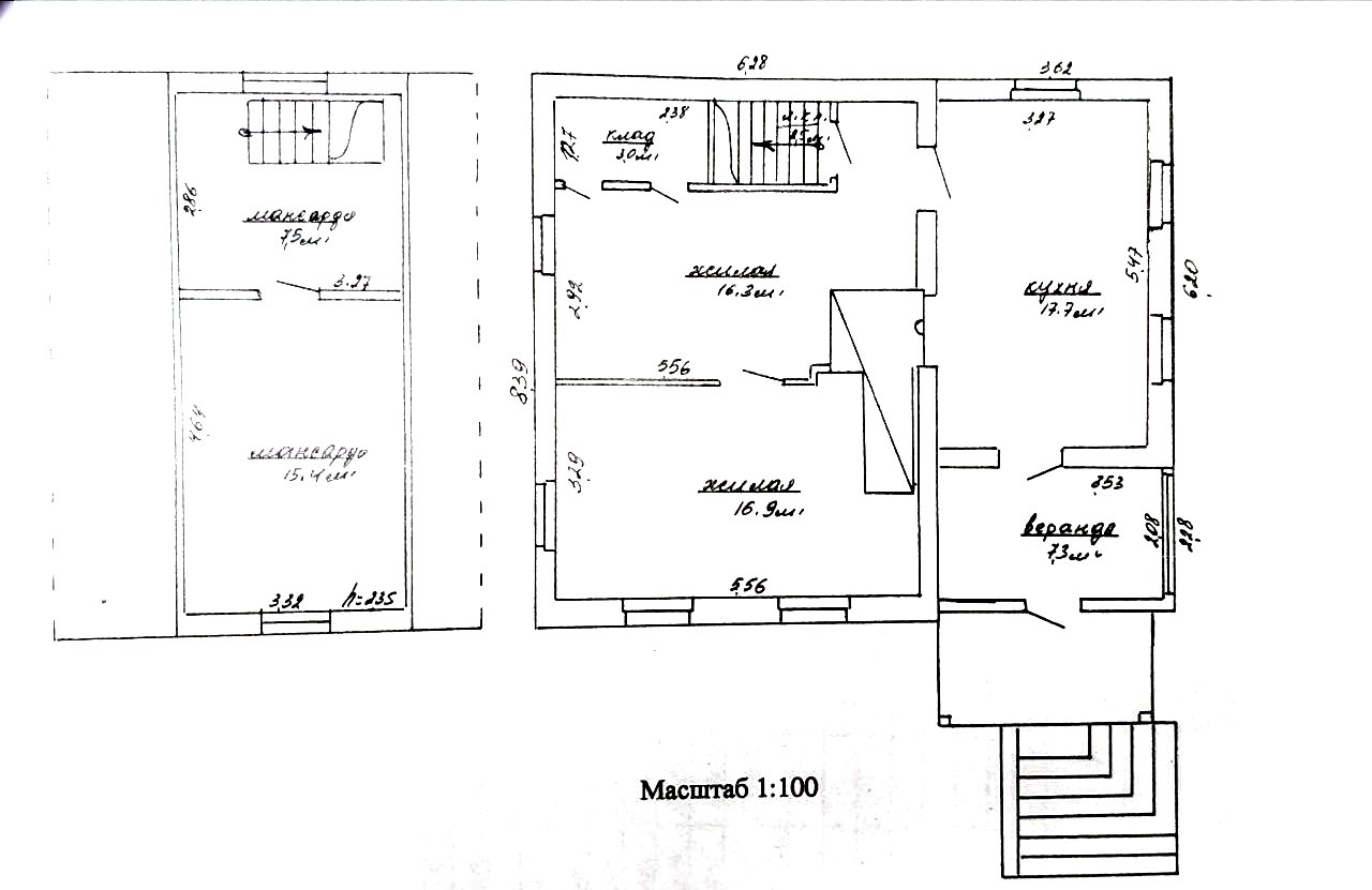 - Объект представляет собой частный дом. В доме имеется подвал и мансардный этаж. Фундамент дома бутовый, стены кирпичные, кровля шифер.