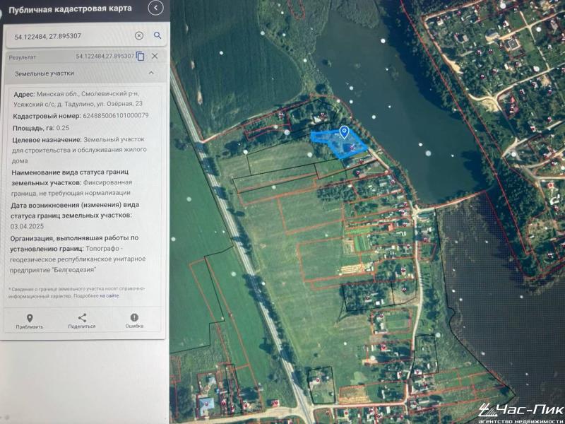 Продаётся прекрасный земельный участок 87 соток в первой береговой линии озера в д.Тадулино! Приглашаем на просмотр; торг! Возможность оборудования собственного пляжа, великолепный панорамный вид на водоём; отличная природа; свет 380; оптоволокно; Московское направление, 30 км от МКАД; целевое назначение участка - строительство и обслуживание жилого дома(ИЖС) - 25 соток в частной собственности и 62 соток для ведения личного подсобного хозяйства в частной собственности; лес, рыбалка, купание, грибы, ягоды, волшебное место для жизни и отдыха; чистейший воздух; все документы к продаже в соответствии с действующим законодательством РБ, фото с участка, отличные подъездные пути; премиум-класс; не упустите свой шанс приобрести "участок мечты"; приглашаем на просмотр! Торг.